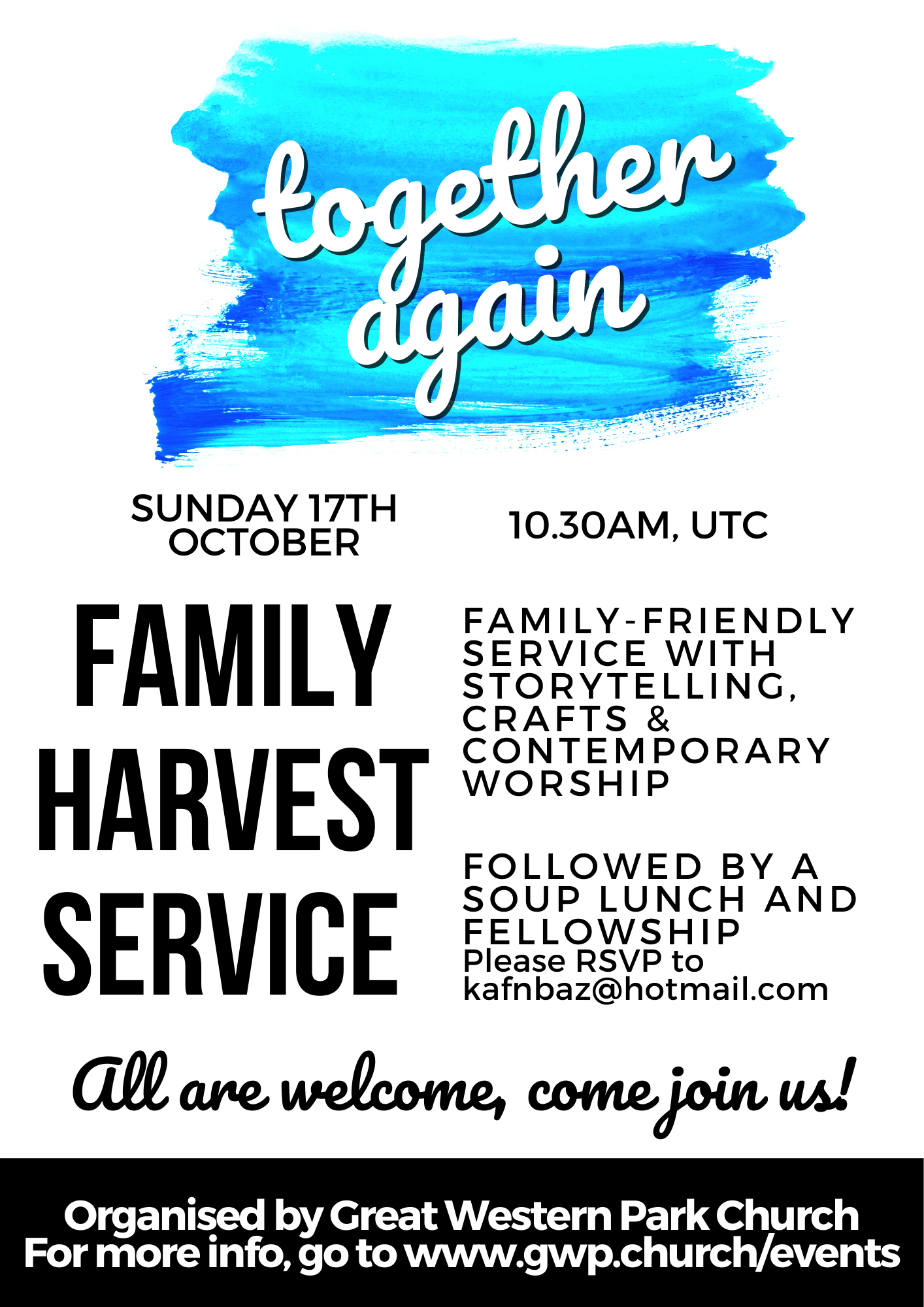 This Sunday we are holding our Harvest Celebration Family Service with storytelling, crafts, and activities for the little ones. It’ll be at 10.30am at the UTC on Great Western Park, followed by a soup lunch, and we’d love to see you there! If you have any questions, please drop us a message on here or email Mark (markbodeker@gwpchurch.org.uk). If you’d like to join us for lunch, please drop Kath an email (kafnbaz@hotmail.com).